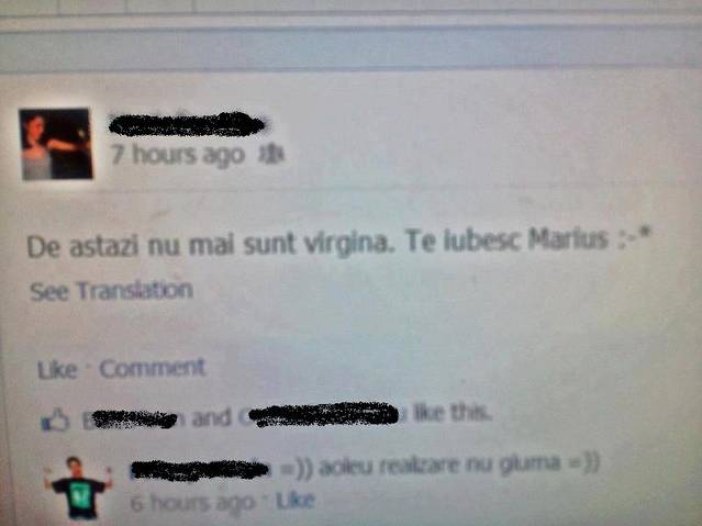Între timp, tinerele de clasa a VIII-a a patriei nu trebuie să fie violate. Ele iubesc și se lasă iubite: „De astăzi nu mai sunt virgină. Te iubesc Marius :-*”, scrie o tânără domniță pe Facebook, cu pupici și fără virgulă, degrabă citată de Libertatea.